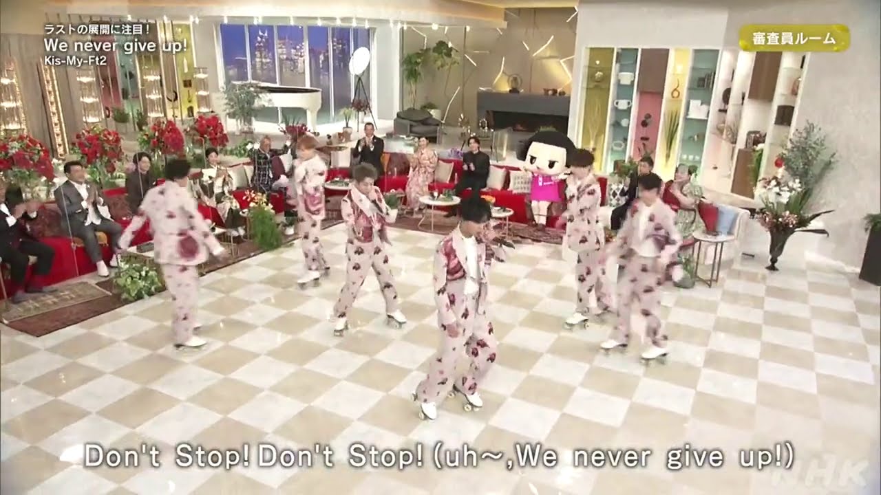 紅白はローラーで別室まで移動しちゃうというサプライズ。広いホールで何かするのかと思っていたらそう来たか!という感じ。狭い通路を結構な速度で走り抜けていく彼らにキュン。そして審査員室、狭いけど7人がぶつかる事なく所定位置につくのがまた素敵!