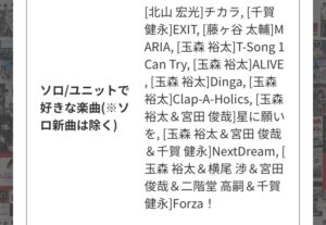 ソロに関しては各担当が未音源化の楽曲をチョイスしろ!みたいな流れになっていたのでそれをチョイスしました。それ以外に推しの好きな曲をぽちぽち。ここに桂木廉名義で出してるMiss youがあったら全力で投票したんですが、さすがにそれはなかった。(むしろこの曲こそ今の歌唱力で歌ってほしい。。。)みやっちとのは星に願いをだけです。あれは玉ちゃんのパートが最高すぎるので。Camelliaよりはクラホリ派っていうとたぶん異端児の玉担です。私、中性的な顔立ちと玉ちゃんから雄を感じる曲が好きなようです。